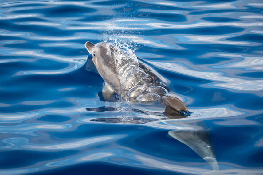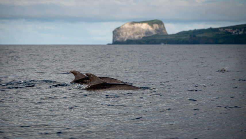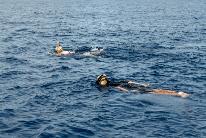 We took our seats in the large inflatable boat and motored offshore, the water flat as glass and a light haze settled over the land. It seemed like only minutes before we came upon a patch of roiling water. As we got closer, we saw fins, and then bottlenose dolphins emerging at the surface. Sophia, our able captain for the day, kept pace alongside the pod at a respectful distance. A few of the dolphins played in our wake, darting back and forth across the bow. Annemarie and Katherine sat on the edge of the boat, feet hanging over the edge, waiting to hear the command to slip into the water. We got in front of a pod, and Sophia gave the command: “Go!” They disappeared into the azure water. At first they seemed a bit disoriented. Alba, the marine biologist, instructed them to look underwater through their snorkel masks. The two swimmers assumed a floating position and watched for several minutes until the pod headed into the distance. It doesn’t look like much to those of us in the boat, but Annemarie and Katherine assure us there was much more going on below the surface.
