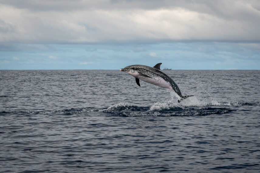 Sophia maneuvered the boat toward another pod. This time Leslie and Beverley prepared to go over the side. Just as the first group did, they slid into the water and watched below them. Leslie let out an audible squeak as the dolphins dart below her. She had a huge grin as she climbed back aboard. “They weren’t interacting with me, but there was a lot of fornication happening down there!” While only half of our group chose to get in the water, everyone shared in their excitement. We peppered them with questions: “What was it like?” “Did you see very much?” “How many did you see?” And seeing Annemarie’s underwater photos and videos afterward made the rest of us feel like we were there, too.