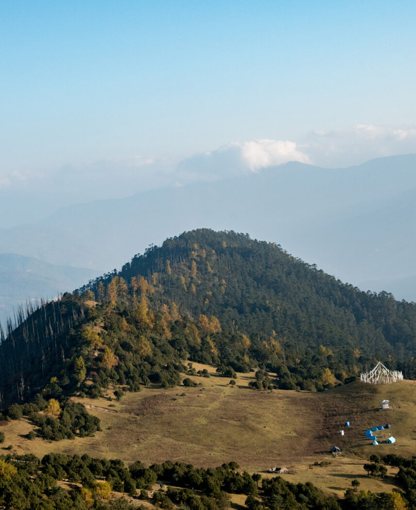 Today we begin our highly anticipated two-day camping trip high up on the hillside outside Paro. We drive to Sang Choekor Buddhist College and start walking at an altitude of about 9,186 feet (2,800 m) through fragrant blue pine and juniper forest to a majestic mountainside temple, Chhoe Chhoe Tse Lhakhang.