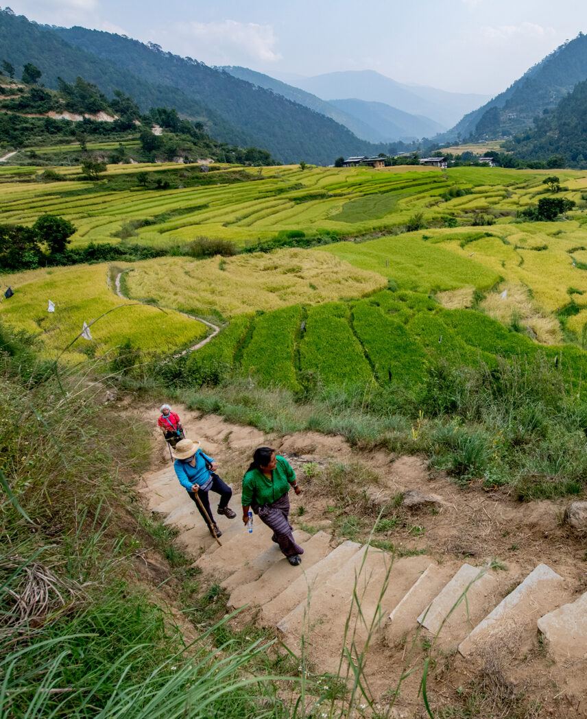 Today, we have a short hike to Khamsum Yuelley Namgyel Chorten through the village and rice paddy fields of Yebisa. We begin by crossing the nerve-jangling suspension bridge and continue onward to the 98 foot (30 m) temple. This path is gradual but there are some steeper sections—the reward is naturally found at the top!