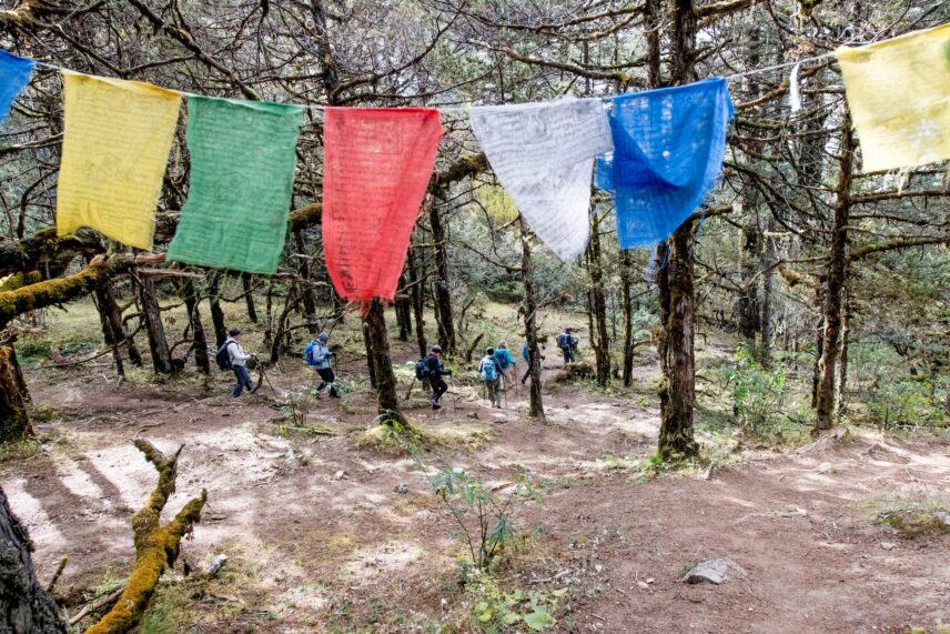 We continue climbing and re-enter the shadows of the forest until we emerge in an alpine meadow of chortens (Buddhist shrines) and colorful prayer flags flapping in the breeze. Our campsite is just below the Bumdra Monastery at 12,476 feet (3,800 m) with sweeping Himalayan vistas. We can visit the monastery and hike a little higher to swallow up the views before returning to camp.