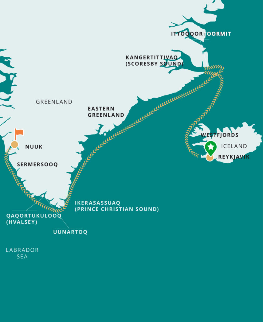 This Greenland Small Ship Expedition starts in Reykjavík, Iceland (airport code: RKV) and finishes in Toronto, Ontario (airport code: YYZ).