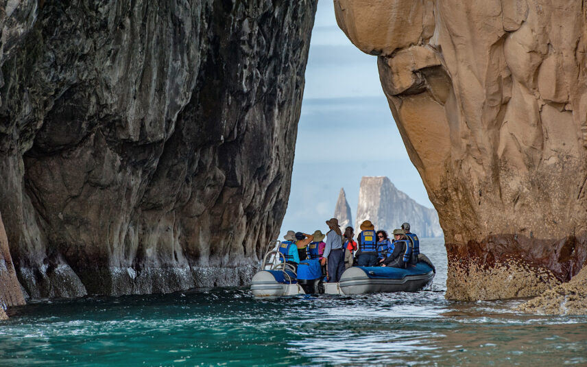 We navigate the labyrinth of rocks and tunnels in search of seabirds, eagle rays and whitetip reef sharks. We can take a short walk along the shore to observe boobies resting on the rocks and marvel at the giant opuntia and candelabra cacti. Short boat rides take us to two superb snorkeling spots with crystal clear water.