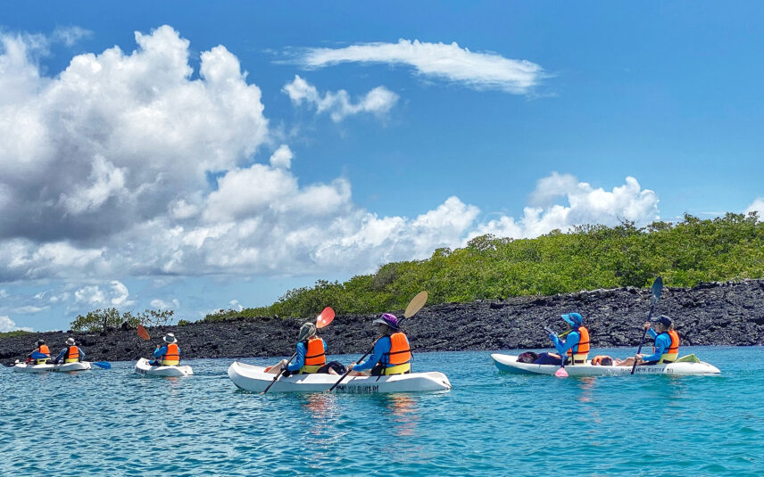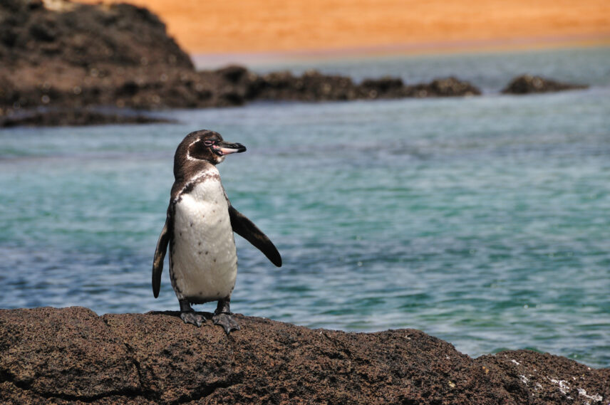 Today we paddle around Isabela’s beachfront and bay in search of penguins. This endemic species is a genuine thrill to see in the wild, whether waddling on land or swimming like decorated Olympians beside the boat. At just 12 inches (30 cm), they are fast and accomplished swimmers.