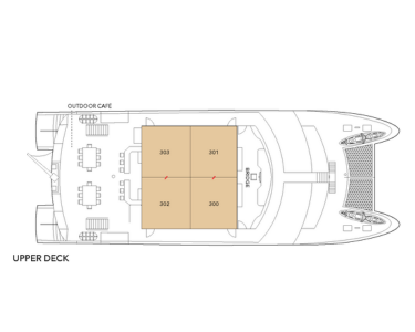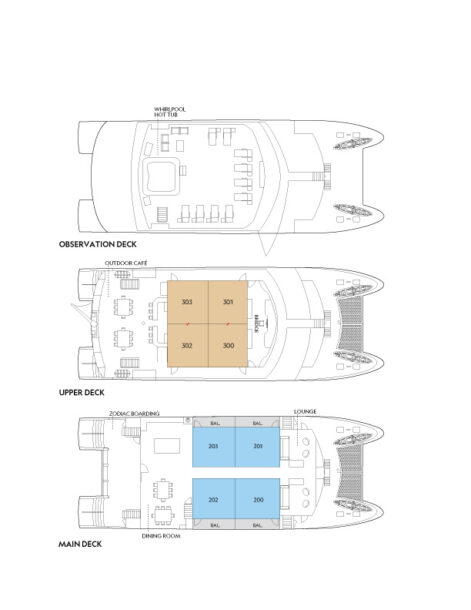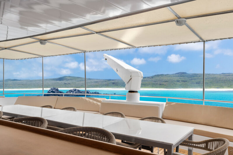 The open-air Observation Deck, which provides 360-degree views, has a shaded area for relaxation, a whirlpool hot tub, and lounge chairs to take in your surroundings. On the wrap-around Upper Deck, dine al fresco at the stern and enjoy spectacular island views from the bow as you watch for dolphins, whales, and other dazzling marine life. The dining room, bar, and cozy lounge with a library are located on the Main Deck, which also serves as the boarding area and marina.