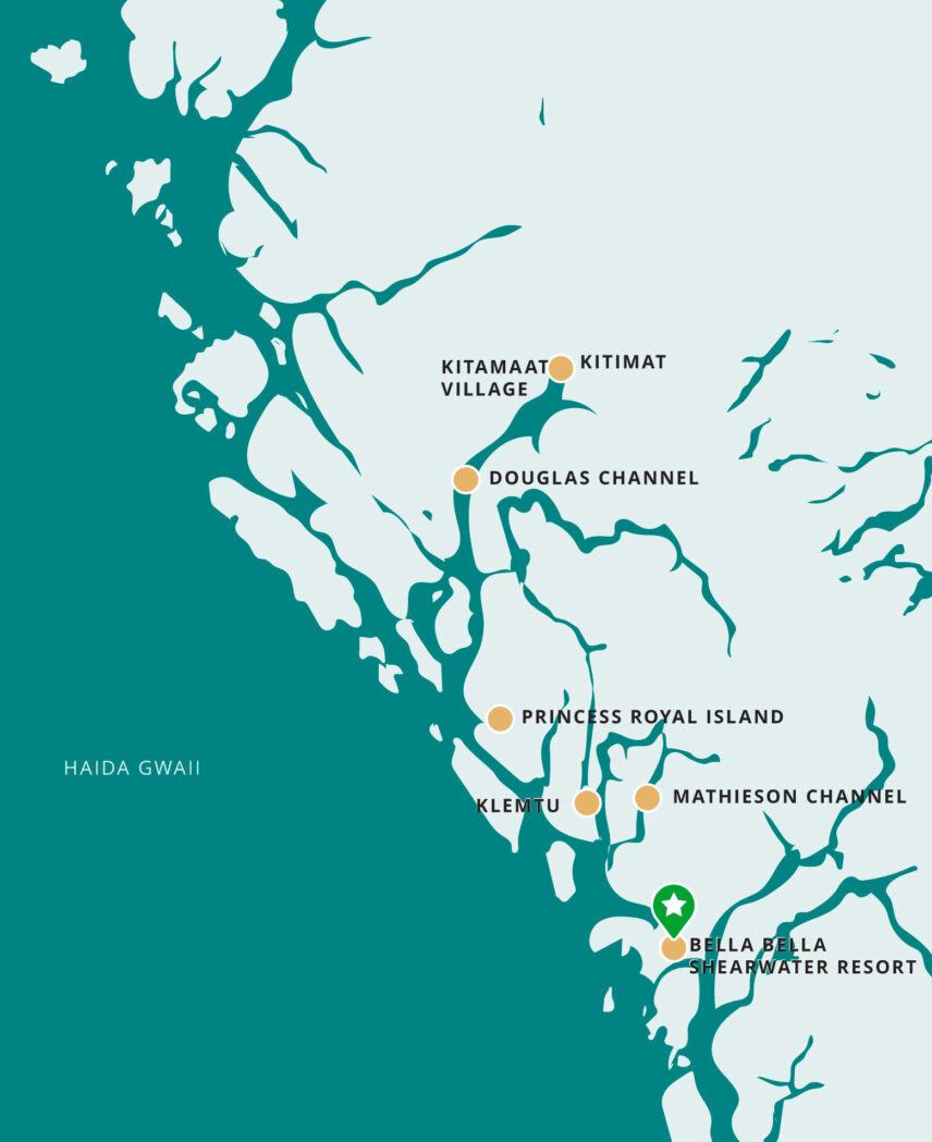 *Please note accommodation is not included in your itinerary on this day, however we have blocked some rooms off to ensure availability.When you land at Bella Bella Airport, grab your bags outside and look for the Bella Shuttle—an easy-to-spot passenger van that will be waiting for you. They’ll whisk you off to the Municipal Dock, where you’ll hop on a water taxi for the 10-minute crossing to Shearwater Resort. (Good news: your shuttle fare is covered in your trip fees!)