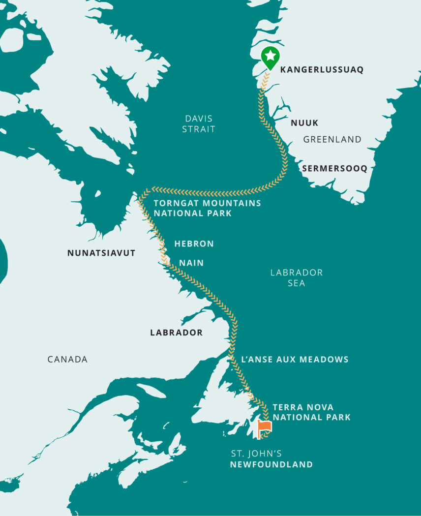 Nature and Inuit heritage are celebrated in this passage through the unspoiled fjords and remote inlets of Greenland to the skinny Narrows of St. John’s, Newfoundland. We hike Torngat Mountains National Park and explore historic sites like the abandoned Moravian Mission in Hebron. We also visit communities in Greenland, northern Labrador and eastern Newfoundland and experience the true heartbeat of the land: the people who live there.
