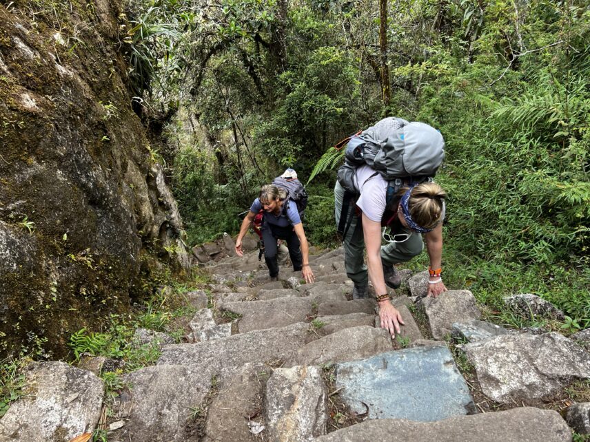 We begin our Inca Trail trek around 7 a.m., climbing for three to four hours toward Llullcha Pampa, where we stop for lunch with sweeping views of Mt. Huayanay. As the trail winds through a hanging valley, we enter the surreal Andean cloud forest, passing through the rare Queñua woodlands with their twisted polylepis trees found only at high elevations.