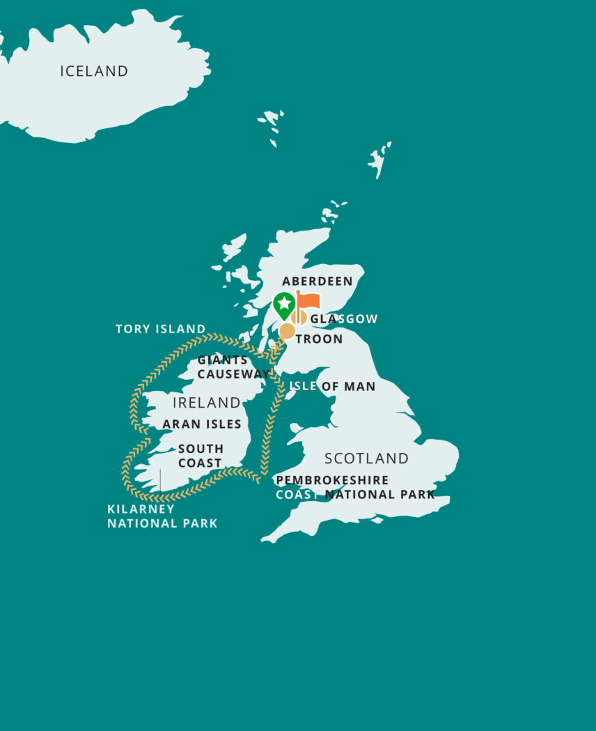 This Ireland and Scotland Small Ship Expedition starts in Troon/Glasgow, Scotland (airport code: GLA) and finishes in Troon/Glasgow, Scotland (airport code: GLA).