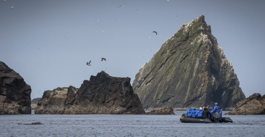 From there, board a Zodiac to explore Papa Stour’s network of sea caves, blowholes, and sculpted rock arches—formed over centuries by wind, tide, and relentless North Atlantic swell.