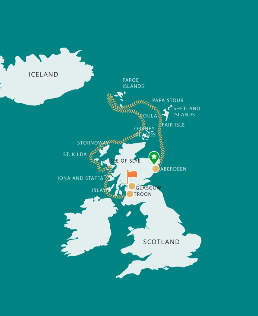 This Scotland and Faroe Islands Expedition starts in Aberdeen, Scotland, (airport code: ABZ) and finishes in Glasgow, Scotland (airport code: GLA).