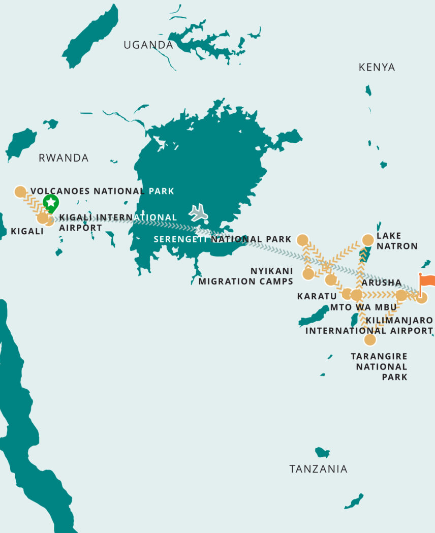 On our new Tanzania and Rwanda Safari Adventure, your journey begins in Rwanda, a country of lush hills, vibrant culture, and powerful history. Explore the welcoming capital of Kigali before travelling into the misty landscapes of Volcanoes National Park, home to the world’s endangered mountain gorillas and some of Africa’s most breathtaking rainforest scenery.