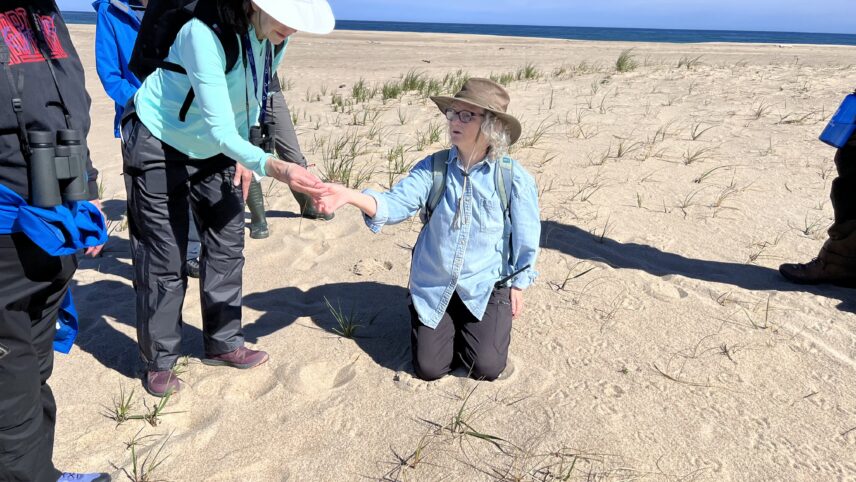 Suddenly, in the middle of explaining the life cycle of the wolf spider living in the horse dung that we’re contemplating, she turns 180 degrees and points at a clump of tall grass and says, “Ipswich sparrow.” The tiny brown sparrow nests only on Sable Island and is hard to see at the best of times, but she has spotted it from behind her back while looking down in the opposite direction. We take pictures of the elusive, highly camouflaged little bird before continuing to observe the pile of stallion manure and learn how they mark territory with feces.